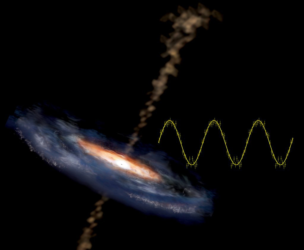 Artist's impression of material falling into a supermassive black hole, forming an accretion disc and jets, together with the averaged shape of the periodic X-ray signal of REJ1034+396 as detected with XMM-Newton.