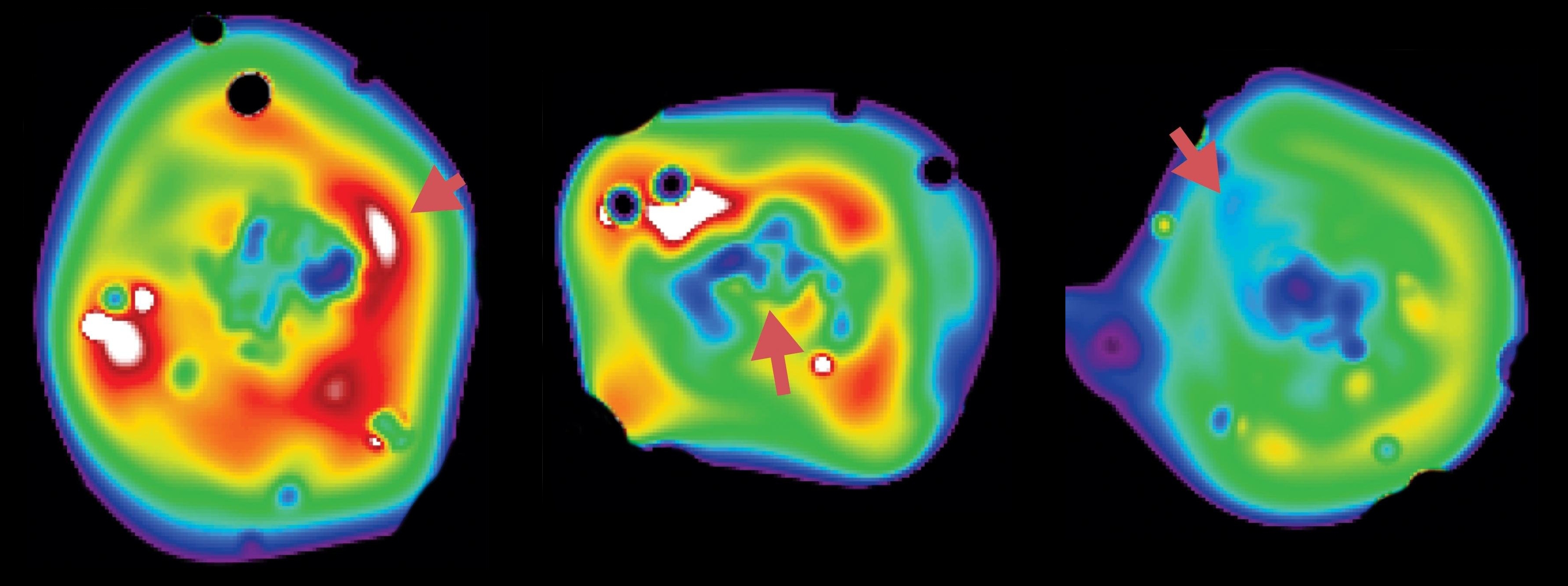 In these XMM-Newton images of three galaxy clusters the colours provide an indication of the temperature of the internal gas of the clusters, and the brightness is a measure of the gas density. From the temperature and density distribution, the physically very important parameters of pressure and entropy can be derived. Entropy is a measure of the heating and cooling history of a physical system. These three images illustrate the use of entropy distribution in the X-ray luminous gas as a way of identifying various physical processes. Entropy has the unique property of decreasing with radiative cooling, increasing due to heating processes, but staying constant with compression or expansion under energy conservation. The latter ensures that a ‘fossil record’ of any heating or cooling is kept even if the gas subsequently changes its pressure adiabatically (under energy conservation).