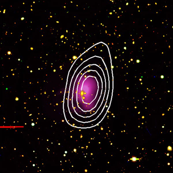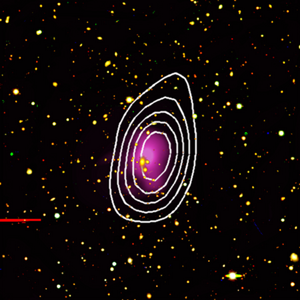 Composite X-ray and optical image of the massive galaxy cluster SPT-CL J2332-5358, with contours depicting the region of the Sunyaev-Zel'dovich effect signature