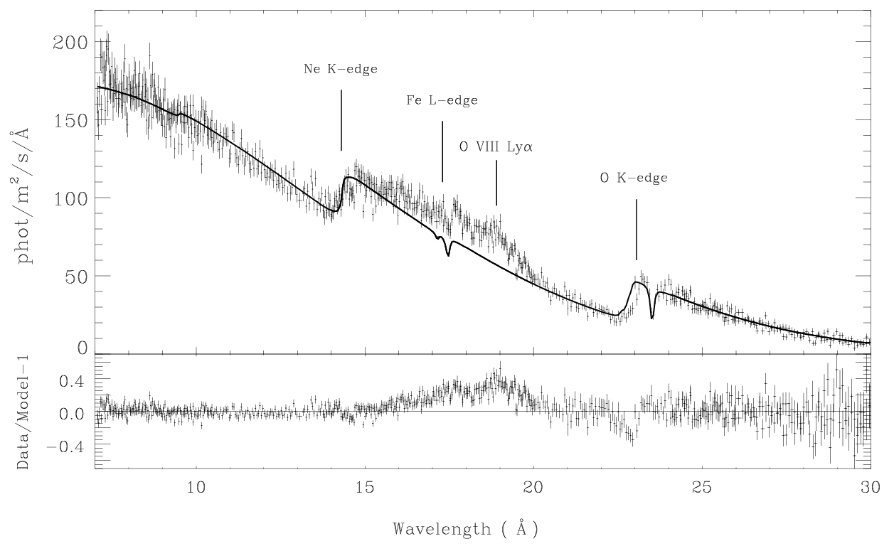 The bottom panel displays the residuals between the data and the best fit model, clearly showing a broad emission feature at 19 Å, corresponding to 0.7 keV. This feature is interpreted as an oxygen line - more precisely, the O VIII Lyman-alpha line, produced by the transition to a lower energy state of the only electron remaining in an oxygen ion; the line profile is broadened both by relativistic effects and by Compton scattering.