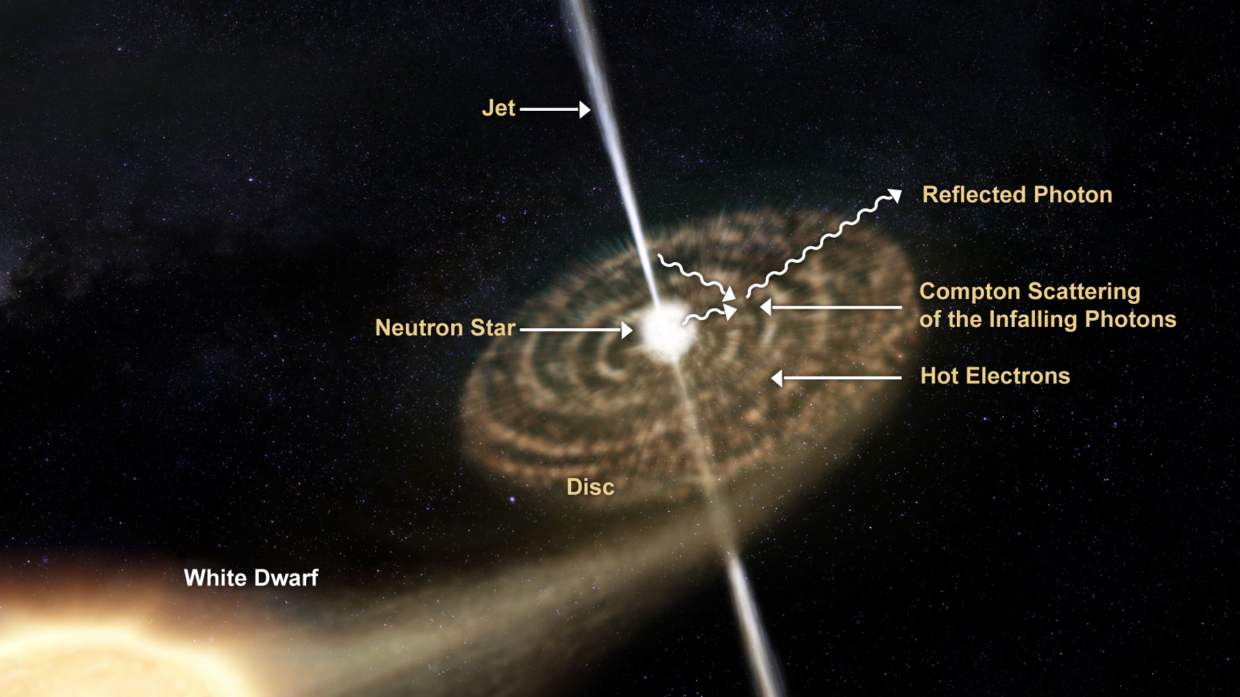 X-ray photons irradiating the disc are reflected by the material within it. As the gas in the disc contains a wealth of hot electrons, photons scattering off these electrons gain energy, resulting in a broadening of the spectral lines towards higher energies. Gravitational redshift and the relativistic Doppler effect broaden the spectral lines towards lower energies - a signature of the strong gravitational field of the neutron star.