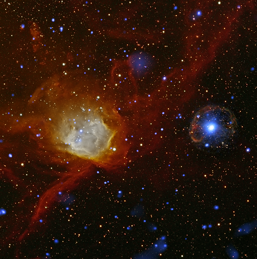 Depicts: Star-forming region in the Wing of the Small Magellanic Cloud, with X-ray pulsar SXP 1062 embedded in its supernova remnant (right) and the nebula N90, home to star cluster NGC 602 (left)