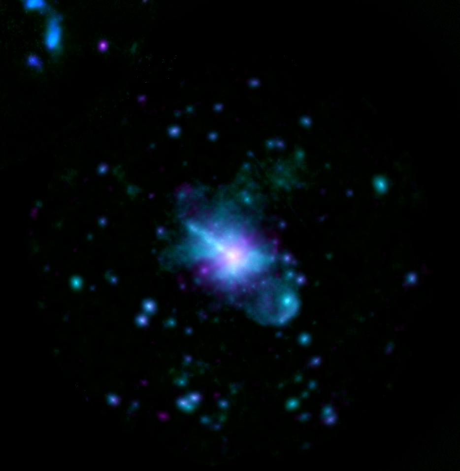 Centaurus A is the closest giant elliptical galaxy containing a radio-loud Active Galactic Nucleus (AGN).The X-ray image reveals emission coming from the active nucleus, at the centre of the image, and from the jets and lobes made up of highly energetic particles emanating from it. A number of foreground point-like sources are also visible, scattered across the image: these are X-ray binaries belonging to our Galaxy, the Milky Way. The X-ray emission from the core of Centaurus A is mainly produced by the material accreted by the central black hole. In addition, the inner part of the two jets that stem from the accretion disc also contribute to the central X-ray source, although they are not resolved in this image.