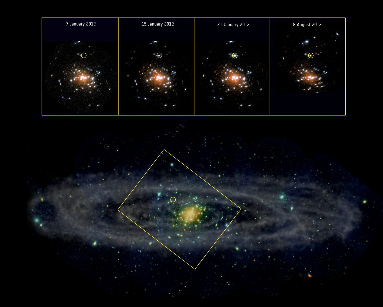 The sequence of images at the top depict the centre of Andromeda and were taken with XMM-Newton on four occasions during 2012. These images illustrate the discovery of a new source, XMMU J004243.6+412519 (highlighted with a circle).