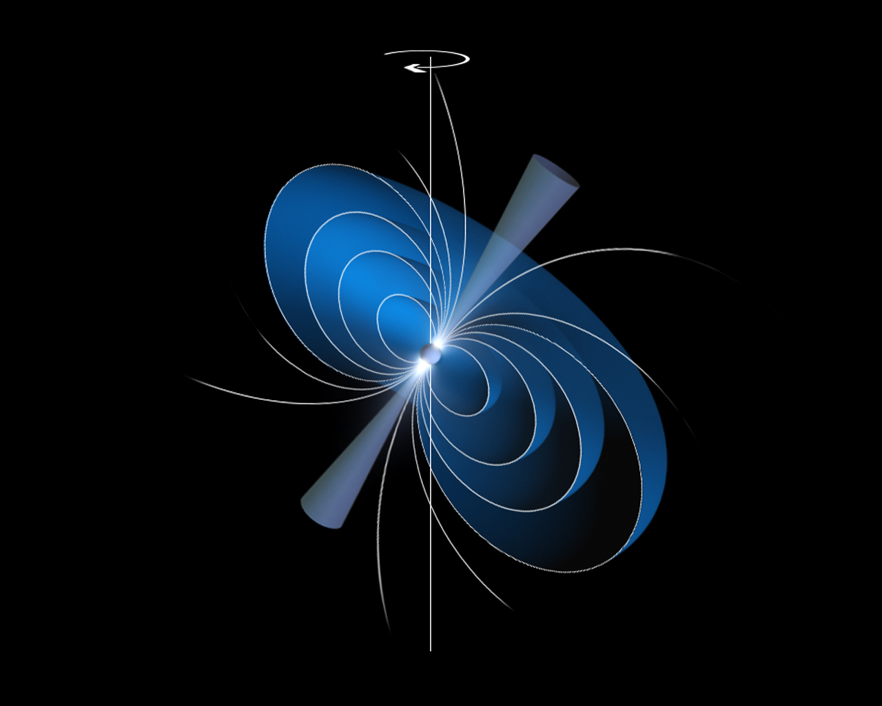 This illustration shows a pulsar with glowing 'hot-spots' that are located at its magnetic poles, the likely sites of X-ray emission from old pulsars. In particular, the illustration shows the pulsar in a state characterised by bright X-ray emission, arising from the polar caps, and relatively low radio emission from the cones that stem from the pulsar's magnetic poles ('X-ray-bright/radio-quiet' mode).
