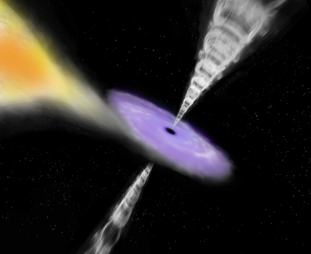 Artist's impression of a black hole feasting on matter from its companion star in a binary system. Matter flows from the star towards the black hole and forms an accretion disc with a temperature so high that it emits X-rays. The black hole can be a fussy eater: instead of swallowing all of the material, it sometimes pushes a fraction of it away in the form of two powerful jets of particles.