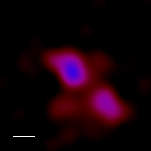 The image is constructed from 2-10 keV X-ray emission and has been smoothed. The colour code represents the intensity of X-ray emission with blue being more intense and red less intense. The white bar indicates a width of 10 arcseconds, equivalent to 3.3 kpc at the distance of this galaxy. North is up, east to the left.