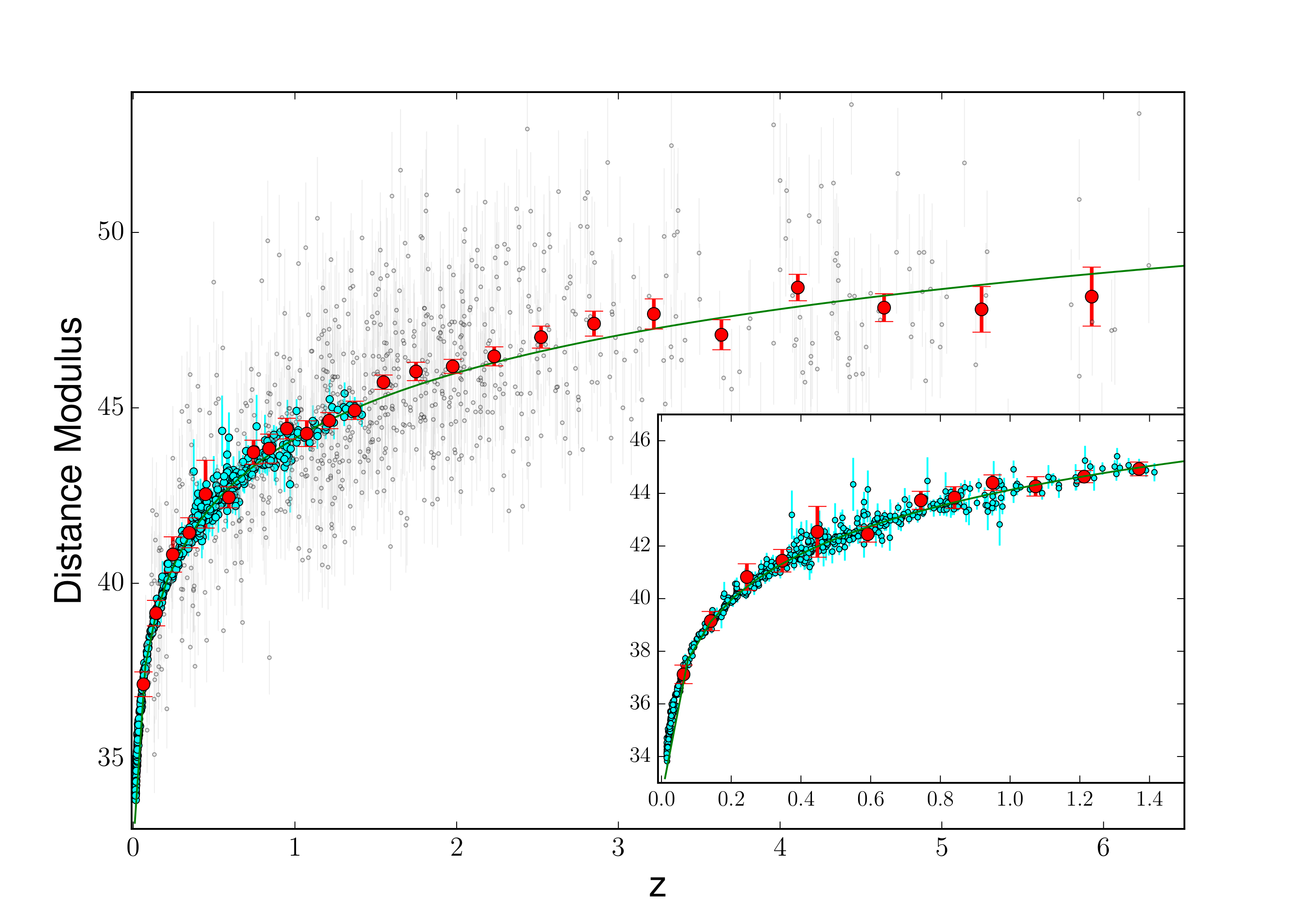The red points show the average values of several quasars with similar redshift. Quasars are a less precise tools to measure distance than type Ia supernovae, but they are available in larger numbers especially at higher redshifts, yielding complementary information about the earlier history of the expanding Universe that is inaccessible to supernova observations.