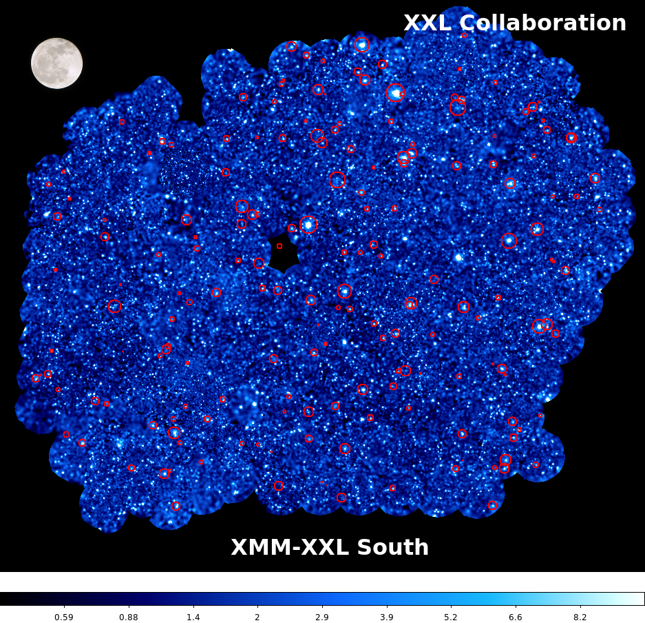 The red circles in this image show the clusters of galaxies detected in the survey. Along with the other field – XXL-North field (or XXL-N) – around 450 of these clusters were uncovered in the survey, which mapped them back to a time when the Universe was just half of its present age.