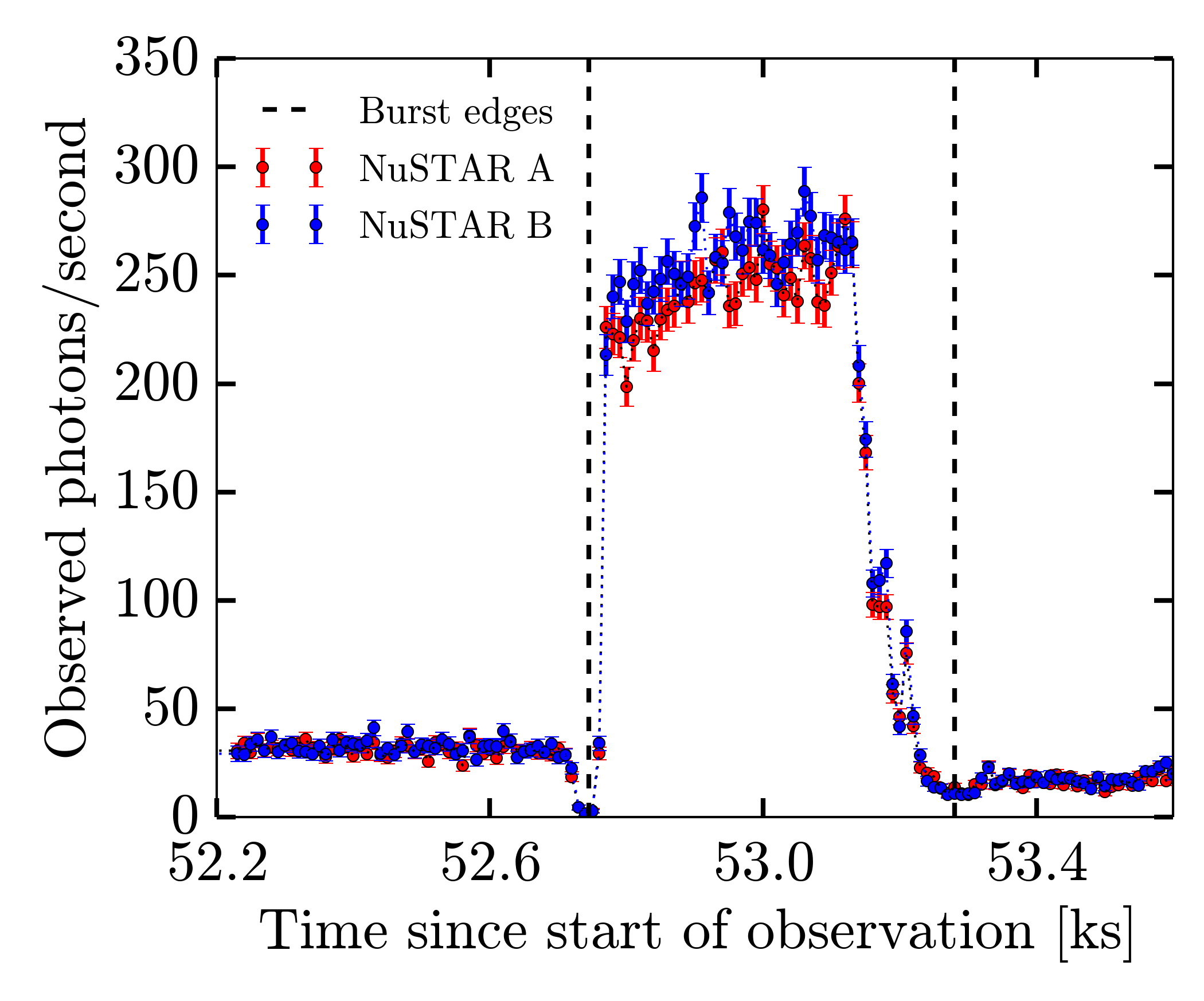 The NuSTAR light curve shows the increase of brightness during a type-II burst that was observed in October 2015. This was part of an observing campaign using three X-ray space telescopes – NASA's NuSTAR and Swift, and ESA's XMM-Newton – to find out more about this system.
