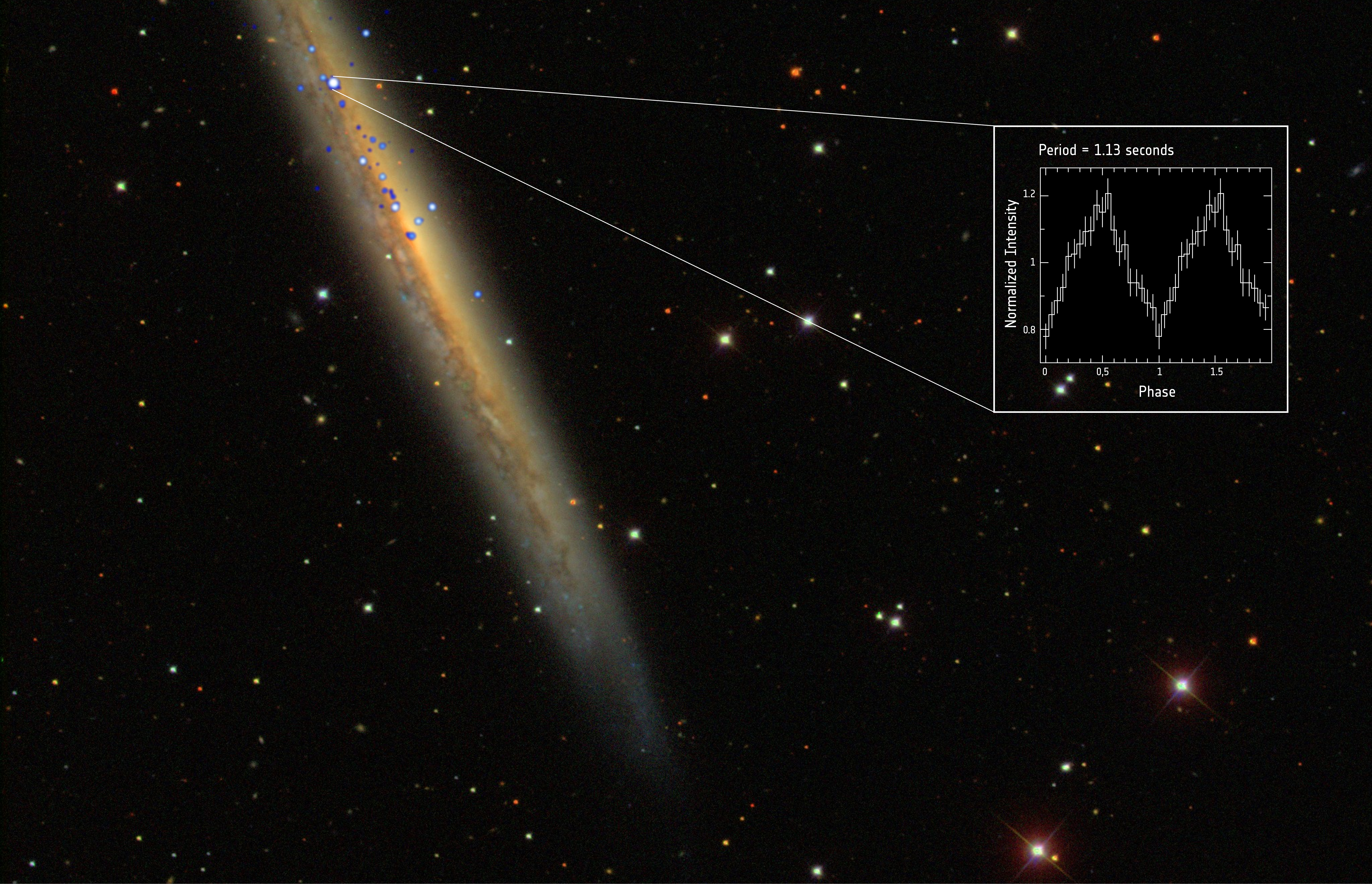 The record-breaking pulsar, identified as NGC 5907 X-1, is in the spiral galaxy NGC 5907, which is also known as the Knife Edge Galaxy or Splinter Galaxy. The image comprises X-ray emission data (blue/white) from ESA's XMM-Newton space telescope and NASA's Chandra X-ray observatory, and optical data from the Sloan Digital Sky Survey (galaxy and foreground stars).
